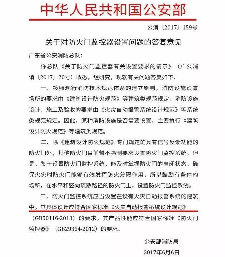 中華人民共和國公安部消防局對廣東省公安消防總隊(duì):關(guān)于對防火門監(jiān)控器設(shè)置問題的答復(fù)意見