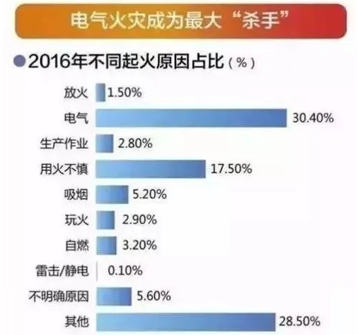 通過(guò)對(duì)近五年來(lái)電氣火災(zāi)事故分析發(fā)現(xiàn),主要有電線(xiàn)短路、過(guò)負(fù)荷用電、接觸不良等幾種原因?qū)е率鹿拾l(fā)生,占比分別為:電線(xiàn)短路約48%;接觸不良約15%;電氣設(shè)備老化約12%;電氣設(shè)備質(zhì)量差約11%;違規(guī)操作約8%;超負(fù)荷用電約6%。其中,電線(xiàn)短路占比最大,如山東壽光火災(zāi)事故和湖北襄陽(yáng)網(wǎng)絡(luò)會(huì)所事故。