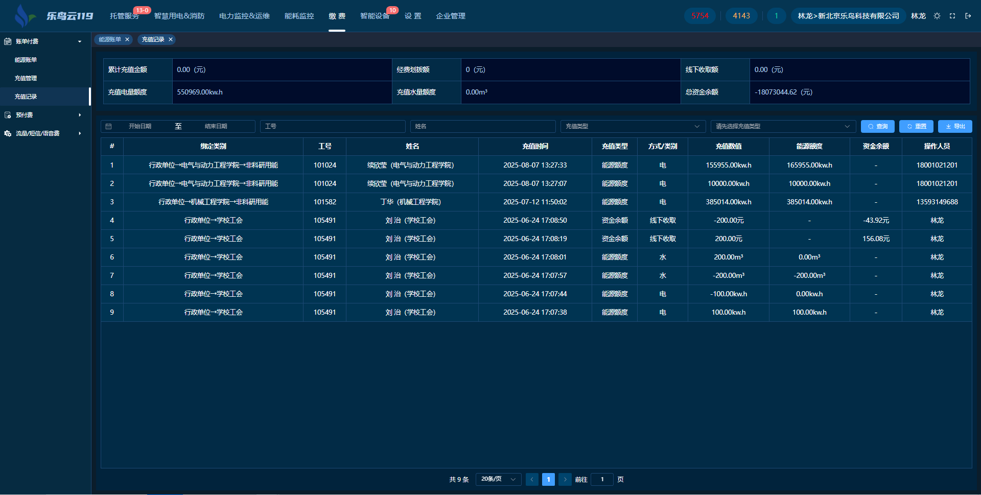 系統(tǒng)實時顯示資金賬戶信息,用戶能單獨設置電價格。充值方式多樣,能源額度可充一年總額度且能增減,資金余額充值有資金劃撥和線下收取兩種方式。