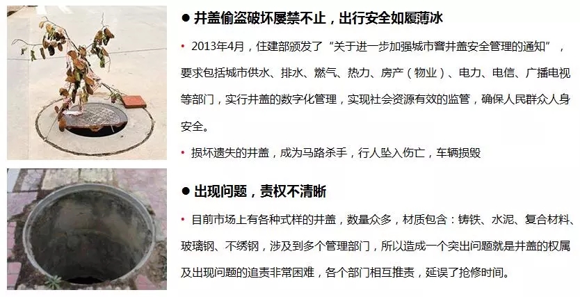 因此國家和地方政府相繼出臺政策,要求實行數(shù)字化管理。核心需求:井蓋是現(xiàn)代城市中重要的公共基礎(chǔ)設(shè)施,實現(xiàn)對城市龐大數(shù)量井蓋智能管理亟待進(jìn)行!