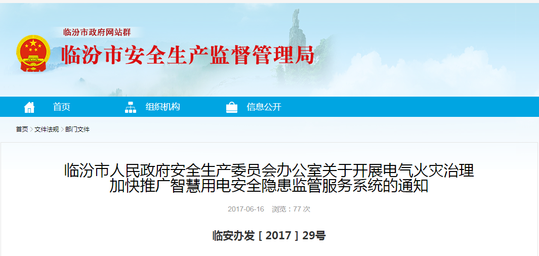 為認(rèn)真貫徹落實(shí)中共中央、國務(wù)院《關(guān)于推進(jìn)安全生產(chǎn)領(lǐng)域改革發(fā)展的意見》、國務(wù)院安全生產(chǎn)委員會(huì)《關(guān)于加快推進(jìn)安全生產(chǎn)社會(huì)化服務(wù)體系建設(shè)的指導(dǎo)意見》(安委[2016]11號(hào))和國務(wù)院安全生產(chǎn)委員會(huì)《關(guān)于開展電氣火災(zāi)綜合治理工作的通知》(安委[2017]4號(hào))及省關(guān)于加強(qiáng)安全生產(chǎn)的一系列重要文件和指示精神,深刻吸取近年來由于電氣火災(zāi)引發(fā)的事故教訓(xùn),加快“智慧安監(jiān)”建設(shè)步伐,真正解決各類火災(zāi)安全事故的防范和隱患排查上的不足,深入推進(jìn)安全生產(chǎn)社會(huì)化服務(wù)體系和安全事故防控綜合治理體系建設(shè),借鑒其他省市的成功經(jīng)驗(yàn),決定在全市開展電氣火災(zāi)治理,加快在各行業(yè)領(lǐng)域和企業(yè)推廣智慧用電安全隱患監(jiān)管服務(wù)系統(tǒng),杜絕因電氣火災(zāi)而引發(fā)的重特大事故。現(xiàn)將有關(guān)事項(xiàng)通知如下: