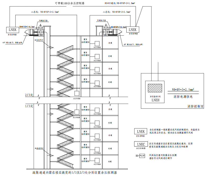 余壓監(jiān)控系統(tǒng)是高層建筑的正壓送風(fēng)系統(tǒng)中用于調(diào)節(jié)消防前室或樓梯間余壓值的系統(tǒng)性監(jiān)控裝置。本系統(tǒng)含余壓監(jiān)控系統(tǒng)主機(jī)、余壓探測器 、余壓控制器、氣管、氣管末端、旁通閥(電動(dòng)多葉對開調(diào)節(jié)閥/電動(dòng)執(zhí)行器)等。 -
