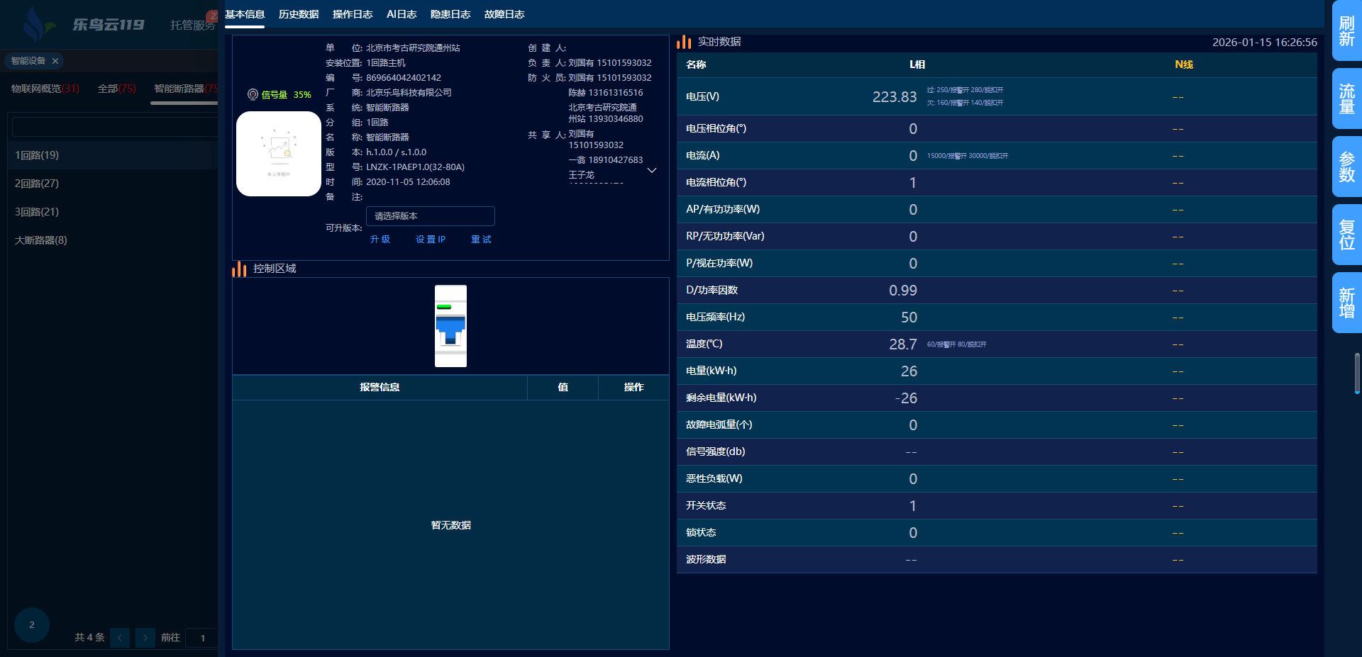 實(shí)時(shí)采集回路電壓、電流等全電參數(shù),按預(yù)設(shè)閾值自動(dòng)觸發(fā)報(bào)警或脫扣保護(hù)