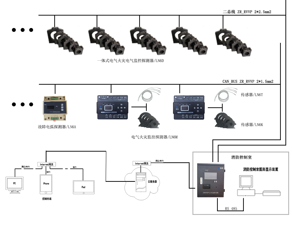 LN6探測(cè)器到LN6H電氣火災(zāi)監(jiān)控設(shè)備使用CAN-bus、 MODBUS-RTU協(xié)議,LN6H電氣火災(zāi)設(shè)備到云服務(wù)器使用internet